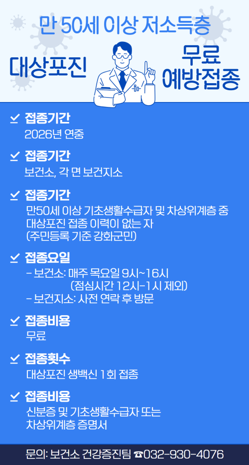 면역력이 떨어지기 쉬운 시기에 가장 걱정되는 질병 중 하나가 바로 '대상포진'입니다. 극심한 통증을 유발 하지만 예방접종 비용이 만만치 않아 망설였던 분들이 많으실 텐데요. 강화군 보건소에서 대상포진 무료 예방접종을 실시한다는 기쁜 소식을 가져왔습니다.
