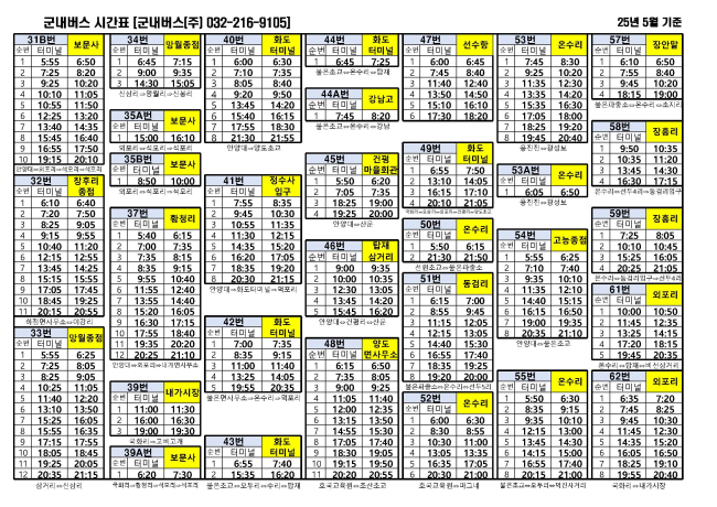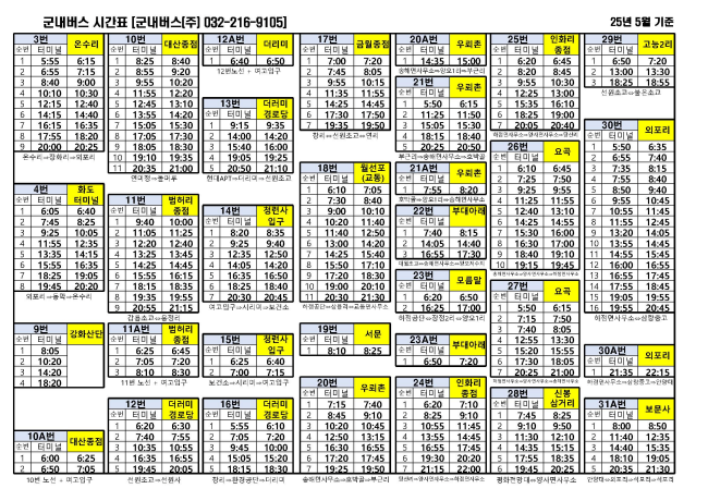 강화군 군내버스 시간표를 공유해 드립니다. 터미널 아래 시간은 터미널에서 출발하는 시간이고 노란색 표시는 해당 장소에서 출발하는 버스 시간을 의미합니다. 버스로 강화도 여행을 하실 때 참고하시기 바랍니다.