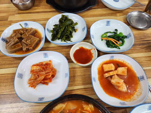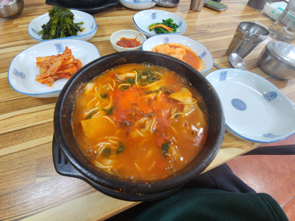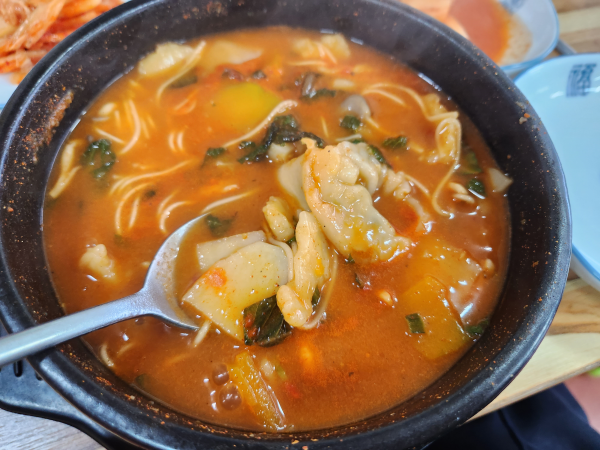 제가 시킨 메뉴는 매운탕 뚝배기 특 입니다. 매번 올 때마다 특을 시켜서, 보통과 어떤 차이가 있는지 잘 모르지만 수제비, 소면이 아주 푸짐하게 들어 있습니다. 매운탕도 맛있지만, 밑반찬은 사장님께서 직접 만들어서 손맛이 느껴지는 식당입니다. 주기적으로 반찬의 종류가 바뀌는 것 같습니다.