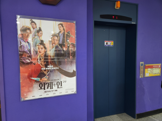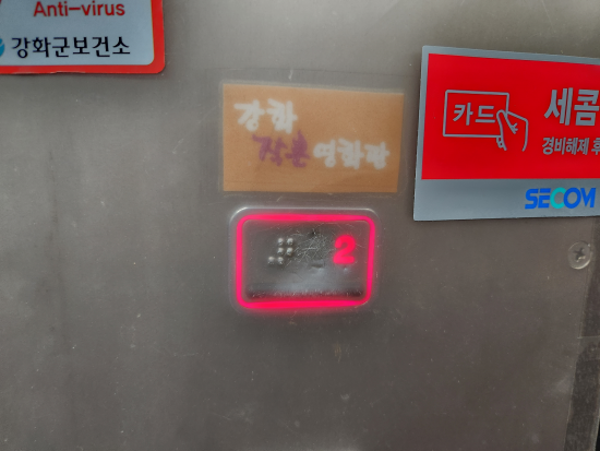 주차를 하고 건물 안으로 들어오면 이렇게 파란색 벽에 영화 포스터가 붙어 있고, 그 옆 엘리베이터를 이용해 2층 강화 작은 영화관으로 갈 수 있습니다.