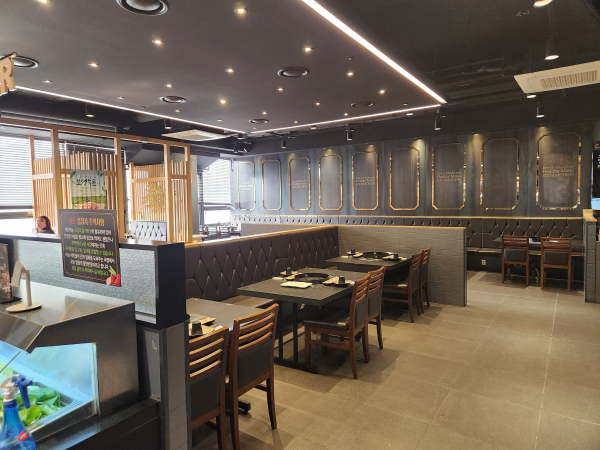 테이블 간의 간격이 좁지 않고 넓어서 주말에 손님이 많아도 여유 있는 식사가 가능합니다. 또한, 내부 인테리어가 블랙과 그레이톤으로 차분하고, 고급스러운 분위기를 느낄 수 있습니다.
