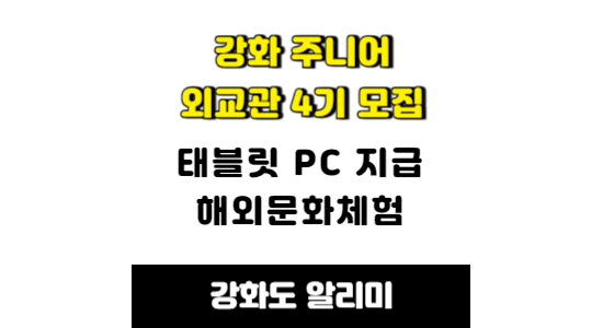강화군 관내 청소년에게 국제적인 역량 강화를 위한 글로벌 활동을 지원하며 인재를 양성하는 강화 주니어 외교관 4기 참여 학생을 모집합니다. 아래 내용 읽어보시고 신청하시기 바랍니다.