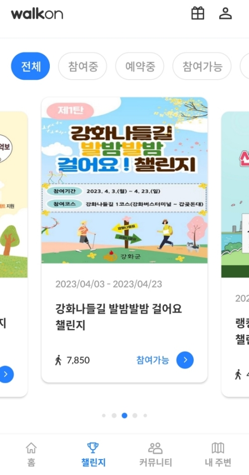 강화나들길 발밤발밤 걸어요 챌린지가 현재 1탄이 진행 중입니다. 4월 1탄을 시작으로 11월까지 총 6탄까지 진행된다고 하니 이번기회에 어플을 설치하시고 걸어요 챌린지 도전해 보는 것은 어떨까요