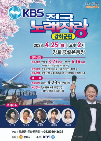 전 국민의 애청 프로그램 'KBS 전국노래자랑'이 따뜻한 봄날에 강화도를 8년 만에 다시 찾아왔습니다. 현재 참가자 신청을 받고 있으니 음악에 열정이 있거나 나의 끼를 발산시키고 싶으신 분은 아래 참가 신청서를 작성해서 접수하시기 바랍니다.