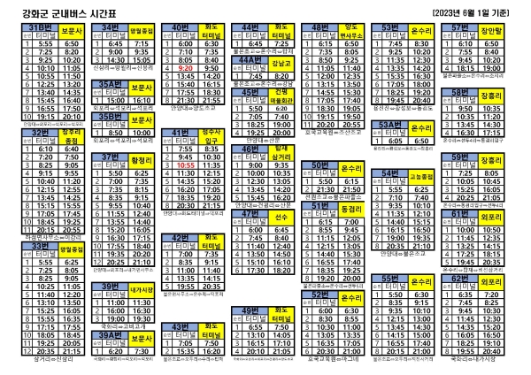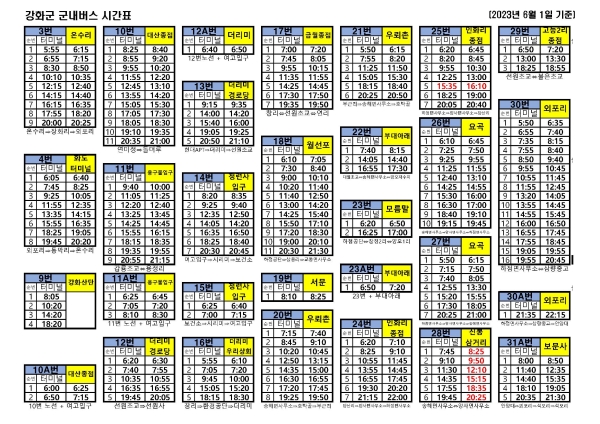 2023년 강화군 버스 시간표 안내드립니다. 강화군 버스 시간표가 2023년 6월 기준으로 최신 시간표로 변경되었습니다.