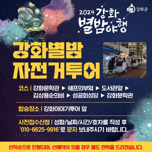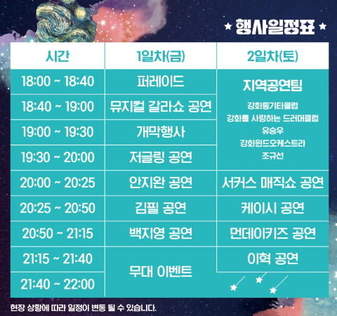 2024년 강화 별밤야행을 개최합니다. 백지영, 김필, 먼데이키즈, 케이시 등 초대가수와 퍼레이드, 체험 프로그램, 먹거리 판매부스 등 다양한 구경거리를 볼 수 있는 행사이기에 아래 내용 잘 읽어보시고 구경오시면 좋을 것 같습니다.