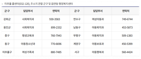 - 문의는 미추홀콜센터(120) 또는 주소지 관할 군, 구청 및 행정복지센터