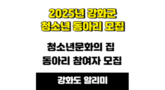 2025년 강화군청소년문화의집 청소년동아리 참여자 모집에 대해 안내드립니다.청소년들이 다양한 활동을 통해 자신의 꿈과 끼를 펼칠 수 있는 기회를 제공하고자 합니다. 아래의 내용을 통해 자세한 정보를 확인해 보시기 바랍니다.