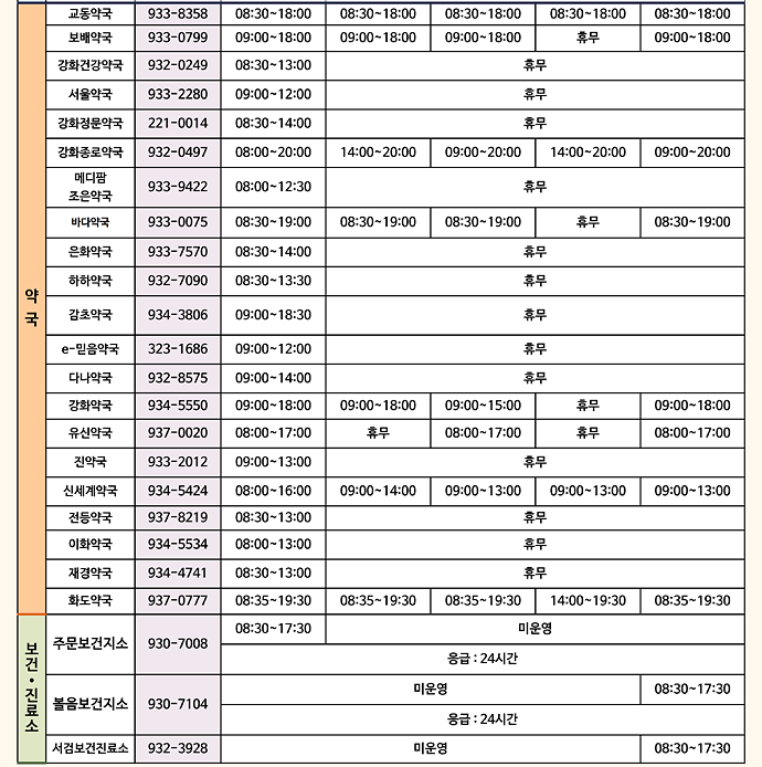 - 강화약국/ 유신약국 / 신세계약국 / 화도약국 연휴기간 운영(일부 일자 제외)